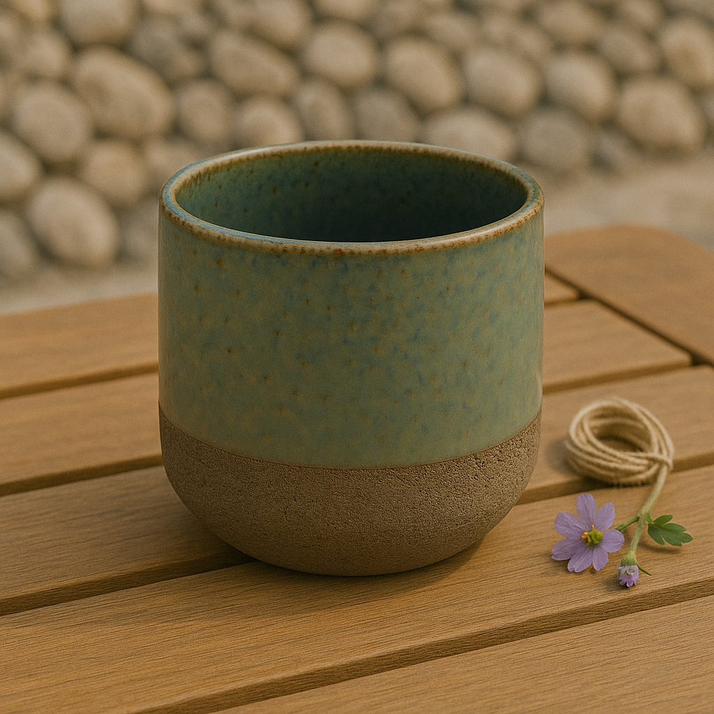 Το Κεραμικό ποτήρι – Γαία αποτελεί έναν ύμνο στη φυσικότητα και την απλότητα της χειροποίητης τέχνης. Με απαλή στικτή υάλωση σε τόνους του γκρι μπλε και βάση από φυσικό ακατέργαστο πηλό, αποπνέει την αίσθηση της ισορροπίας και της γείωσης.