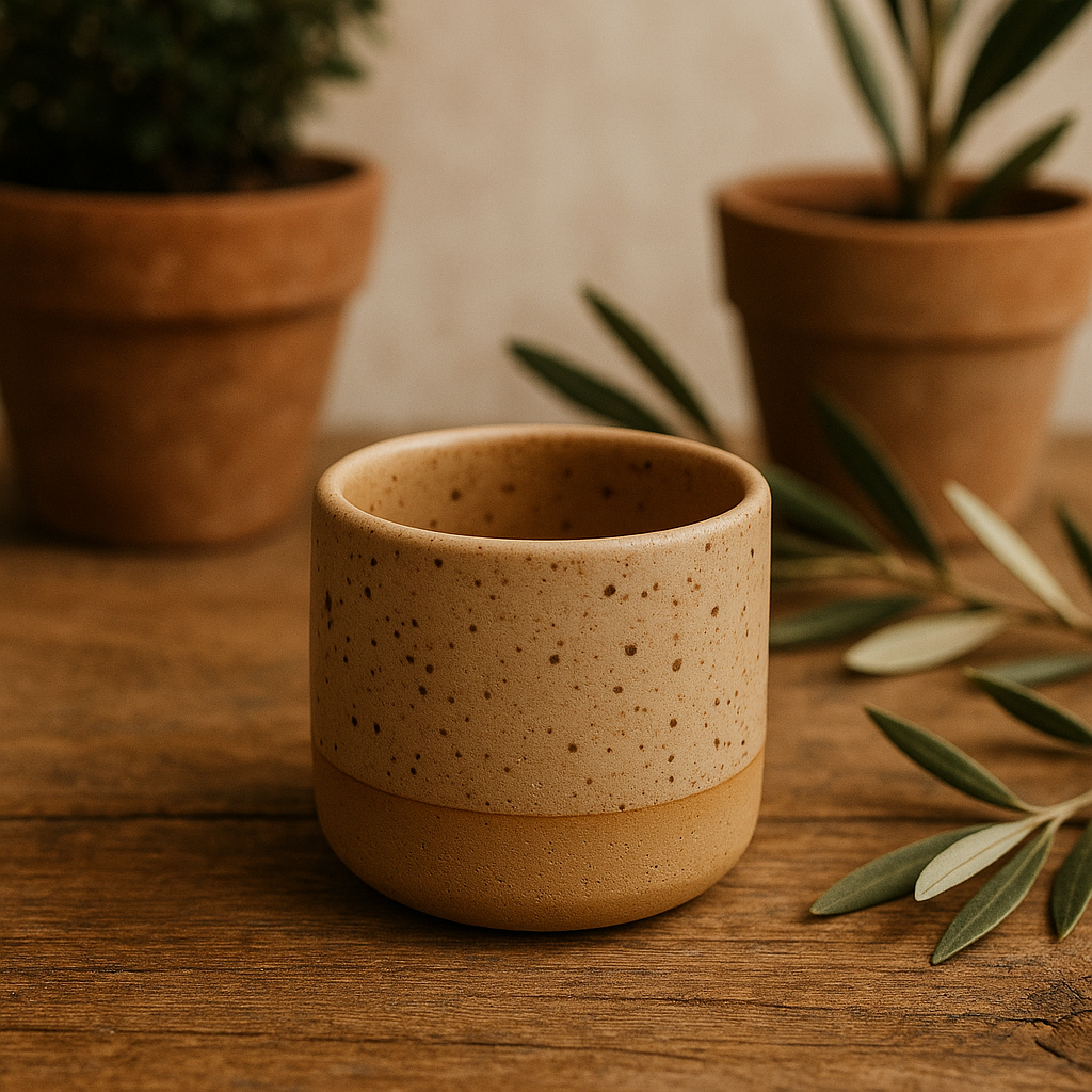 Το “Άμμος” είναι ένα μικρό, χειροποίητο κεραμικό φλιτζάνι χωρίς χερούλι, εμπνευσμένο από τη χρωματική και υλική απλότητα της φύσης. Το πάνω του μέρος διακοσμείται με διακριτικές πιτσιλιές σε γήινο φόντο, ενώ η βάση παραμένει ακατέργαστη, ενισχύοντας τη φυσική αίσθηση του πηλού.