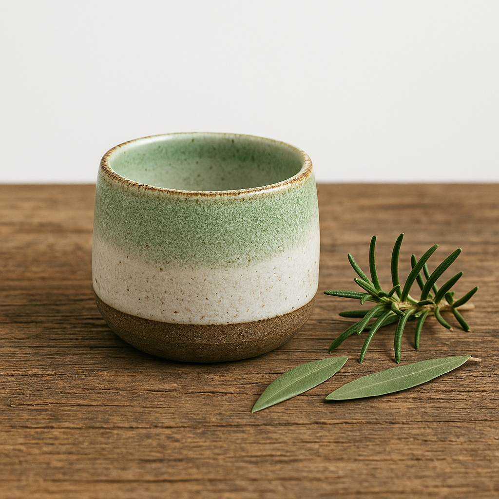 Το «Ιόνιο» είναι ένα μικρό χειροποίητο κεραμικό φλιτζάνι χωρίς χερούλι, εμπνευσμένο από την ηρεμία της φύσης και τα αρώματα του ελληνικού μεσογειακού τοπίου. Με πράσινο, υπόλευκο και καφέ φυσικό τόνο πηλού, φέρνει μια γήινη αισθητική που ξεχωρίζει.