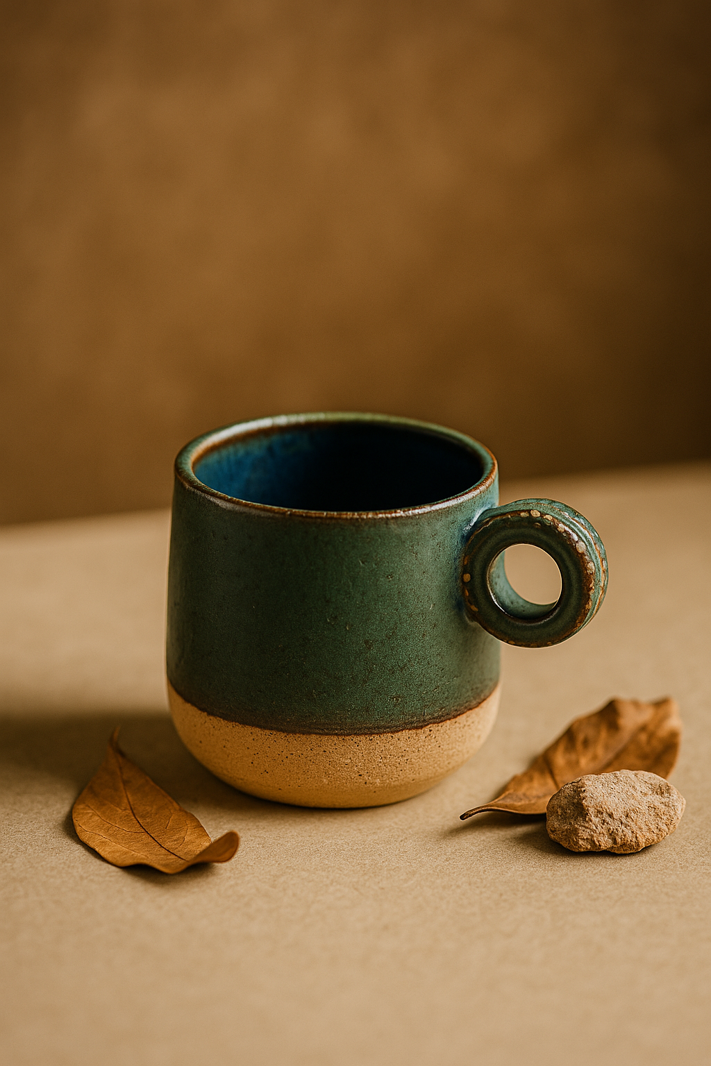 Κεραμική κούπα, χειροποίητη με ιδιαίτερο κυκλικό χερούλι και φυσικές αποχρώσεις του μπλε σε πηλό με γήινο χρώμα. Ιδανική για καφέ ή τσάι, προσφέρει αυθεντικό χαρακτήρα σε κάθε στιγμή.